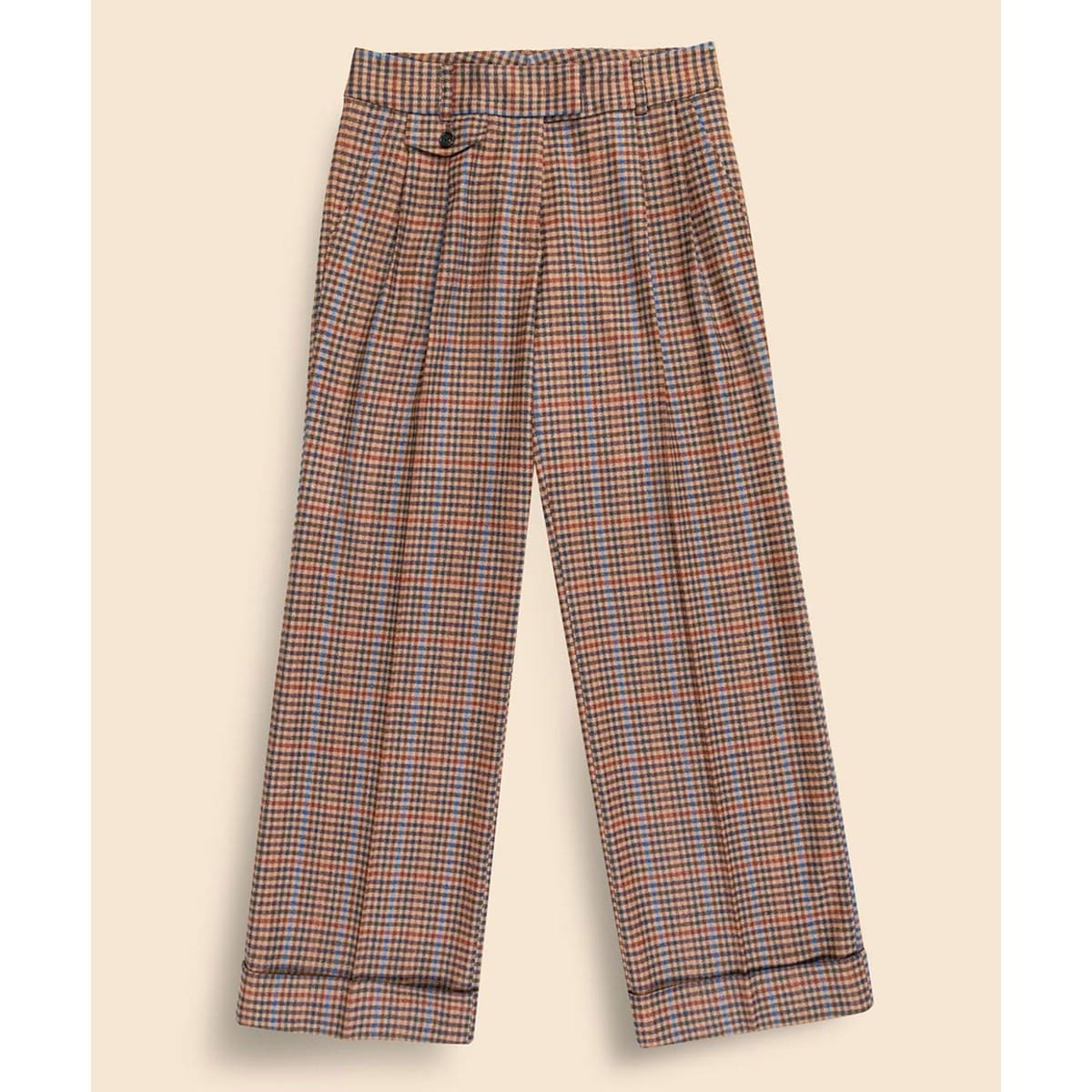 ブラウンベースに明るいブルーとレッドを組み合わせた、印象的な配色のオリジナルガンクラブチェック柄の生地を使用。2本のタック入りで裾を折り返したダブル仕様のマニッシュなシルエットです。ビジネスシーンから、タウンユースまでオンオフ問わず活躍します。