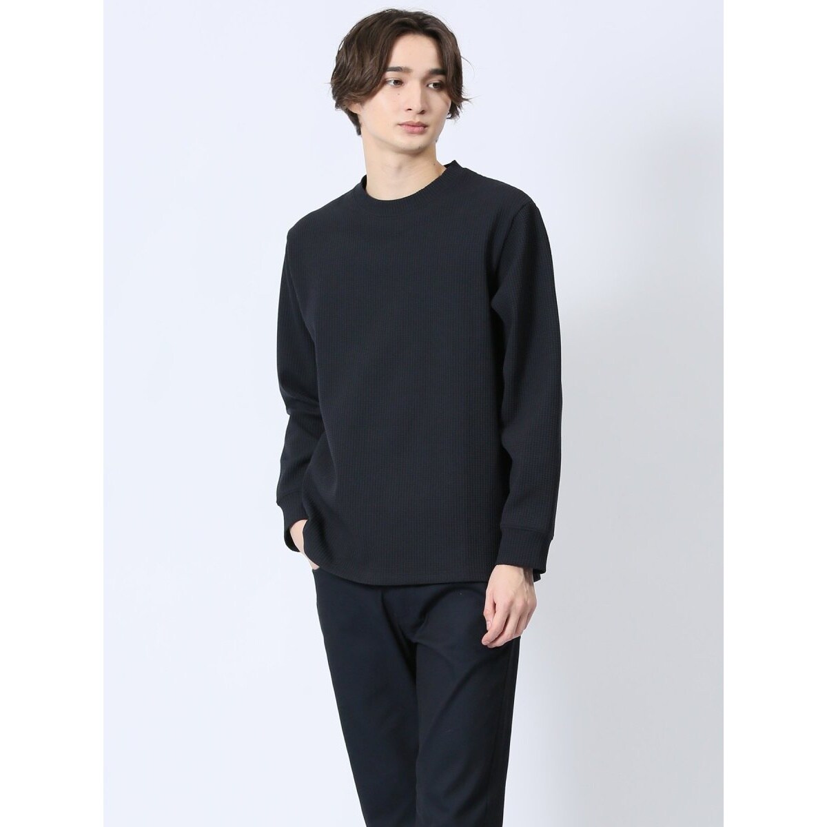 シンプル過ぎない存在感のあるクルーネックの長袖Tシャツです。ワッフル素材で着映えするルックスに仕上げています。一枚で着るのはもちろん、ジャケットやシャツ、ベストのインナーとしても便利なアイテムです。