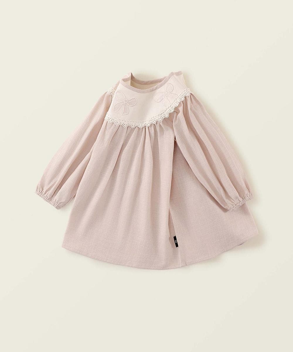 襟部分に刺繍やアップリケで施されたリボンデザインが特徴。襟元にあしらわれたレースが上品さと可愛らしさを兼ね備えた印象を与え、細部までこだわったデザインアイテム。胸元のギャザーから広がるゆったりとしたシルエットで動きやすさと快適さ抜群。