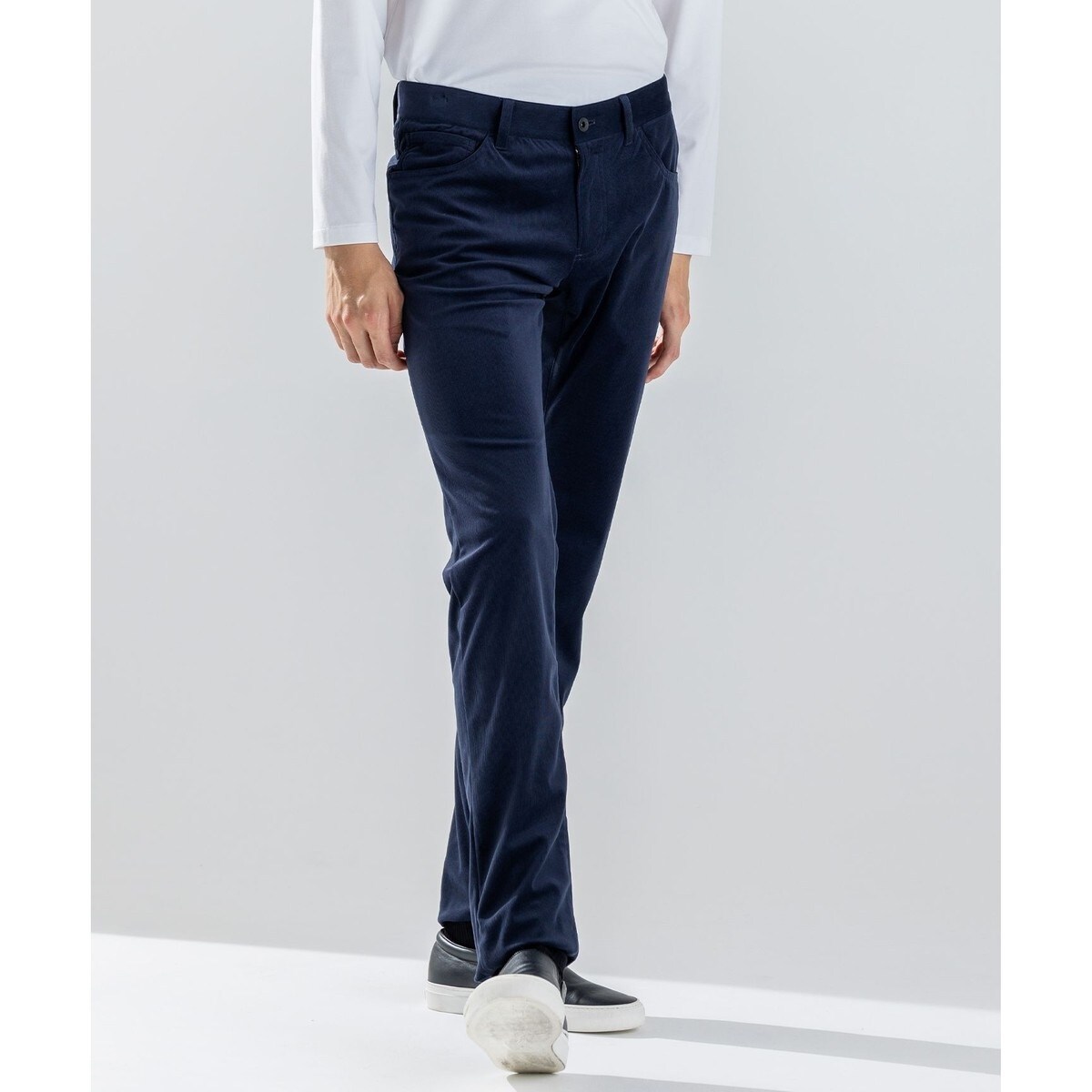 オールシーズン対応の5ポケットデザイン。脚にぴったり沿う細身のスリムストレート。若干浅めに設定された股上で、脚のラインをシャープに演出