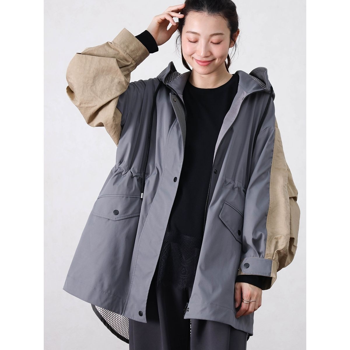 大き目のフードにゆったりとしたAラインシルエットで、ラフさの中に程よい女性らしさをプラスしてくれます。