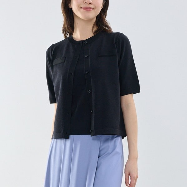 調温機能糸を使用した、五分袖のクルーネックカーディガン。細番手の糸で編み立て、春夏仕様のなめらかな肌触りに仕上げています。同色のラメ糸で襟まわりやポケット、袖口、前立ての編地に変化をつけることで、さりげない華やかさときちんと感を演出。同素材トップス(30-61-15-917)とアンサンブルでの着用はもちろん、単体でも幅広いコーディネートに活躍します。