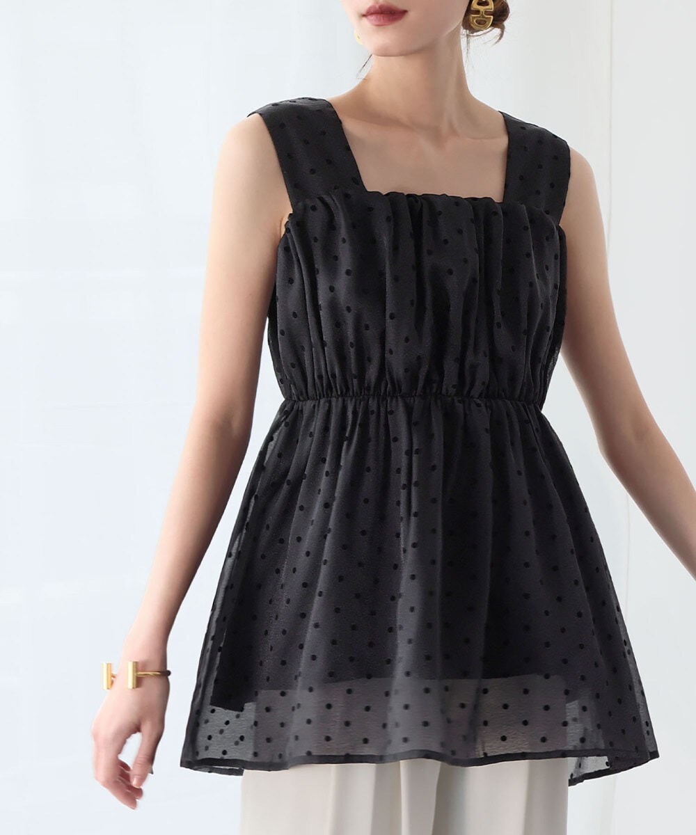 ドット柄 裾バルーンブラウス 黒 ポンチョとノースリーブの2way仕様