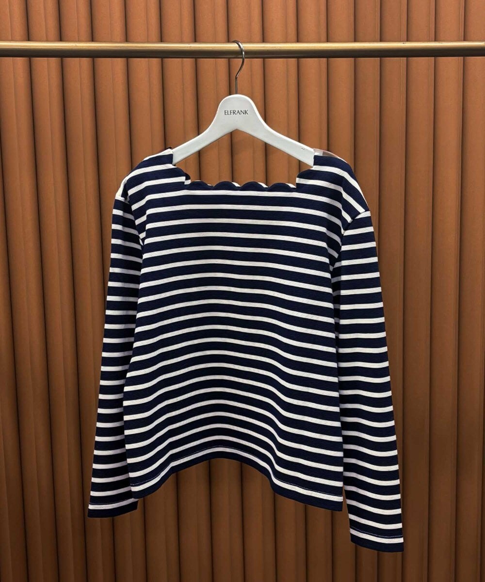 スカラップのスクエアネックがレディーな印象を与えてくれるボーダートップスです。