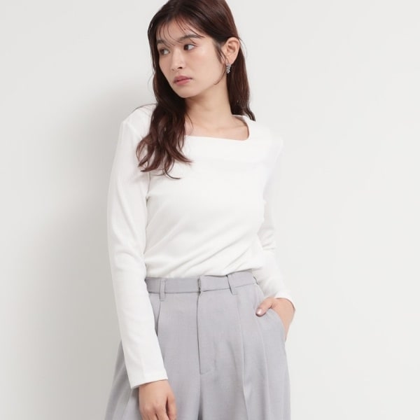 すっきりと鎖骨を見せるスクエアネックのテレコトップス。