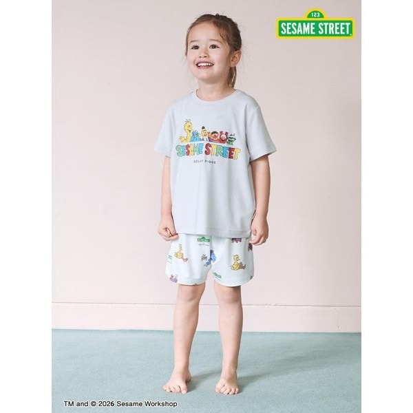 エルモ、クッキーモンスター、ビッグバード、そしてSESAME STREETのロゴをランダムにプリントしたキッズサイズの総柄ショートパンツです。それぞれのキャラクターの傍には、ピケブルーのボーダー柄のモコモコをまとったアイテムが描かれているのがポイント。オフホワイトベースの柔らかなカットソー素材で、春先から夏にかけて長くご使用いただけるアイテムです。同シリーズのTシャツと合わせるのがおすすめ。レディース、メンズ、ベビーサイズも揃えているので、ファミリーでリンク・コーディネートもお楽しみいただけます。