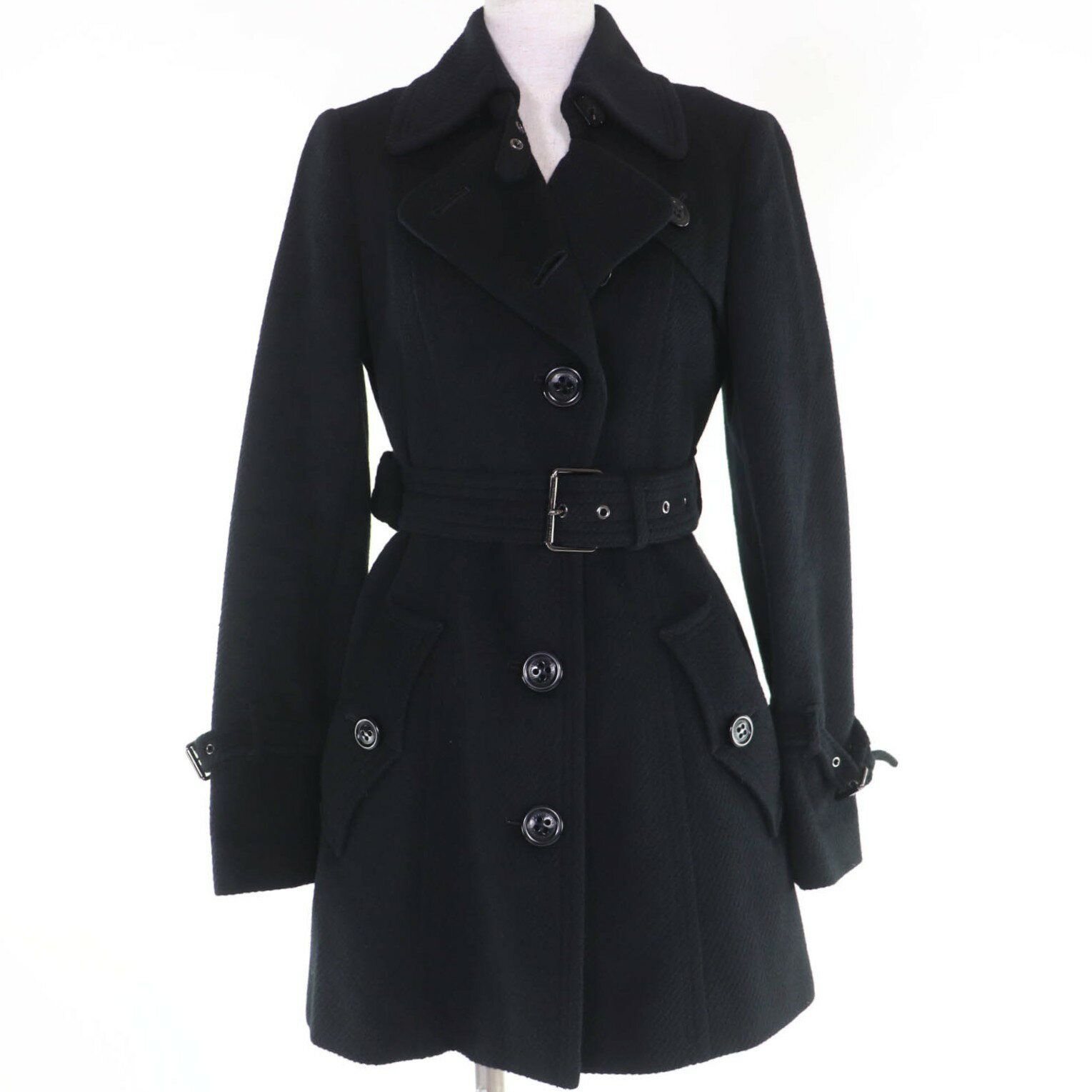 美品☆BURBERRY BLUE LABEL バーバリーブルーレーベル ウール アンゴラ 襟フォックスファー・ベルト付 コート ブラック 38 正規品 レディース【中古】