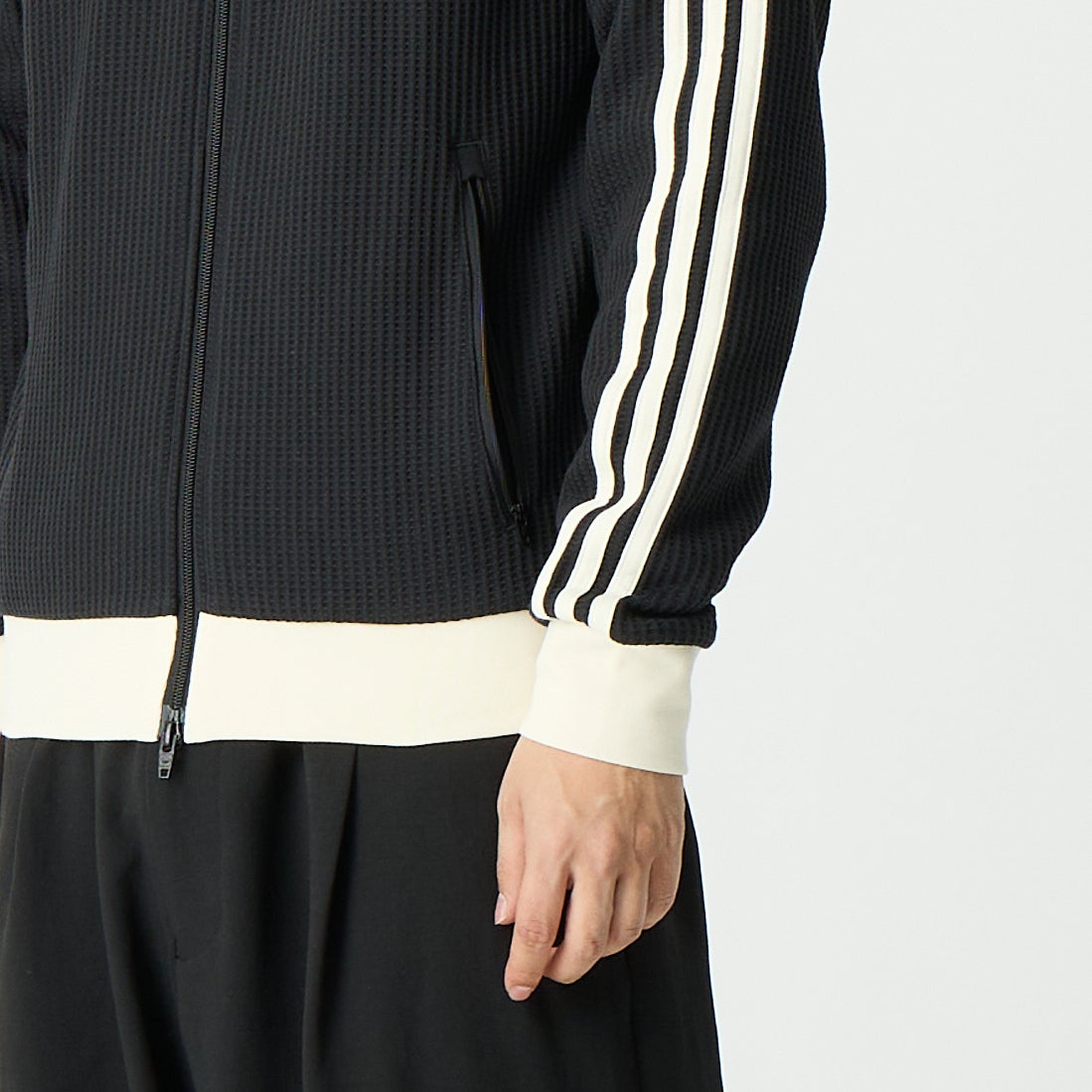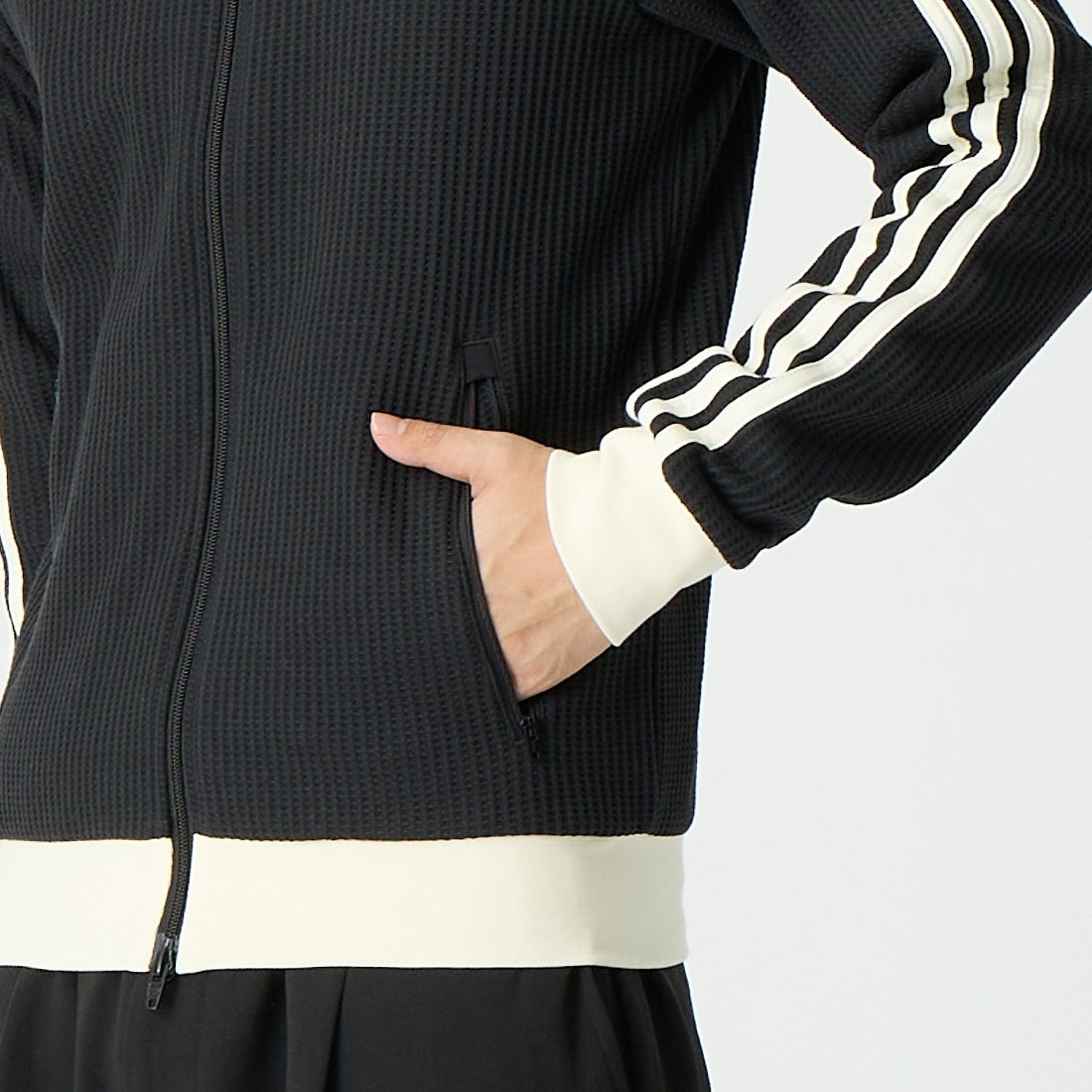 リサイクル素材と再生可能素材を一部使用し、50年以上にわたりスポーツとファッションの両面でアイコンとして愛されてきたトラックトップを、現代的にアップデートした一着。柔らかなポリエステルとコットンの混紡素材を用い、ワッフル構造によるさりげない凹凸感が上品な表情を演出します。身体を包み込むスリムフィットながら窮屈さはなく、袖口・裾・スタンドカラーをタイトなリブで仕上げることで、クリーンでクラシックな印象に。フロントは2ウェイジッパー仕様で着こなしのアレンジも自在で、袖に走るスリーストライプスがスポーティーな存在感をプラスします。セットアップはもちろん、デニムやジョガーパンツとも相性が良く、UNITEFITシステムにより性別や体型を問わず幅広く楽しめるアイテムです。