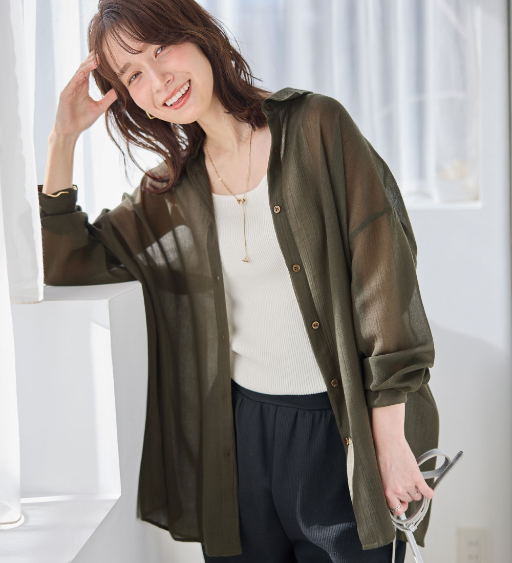 夏の万能羽織り:日よけや冷房対策として、Tシャツやタンクトップの上にさっと羽織るだけ!ぐっとこなれた印象を演出。
