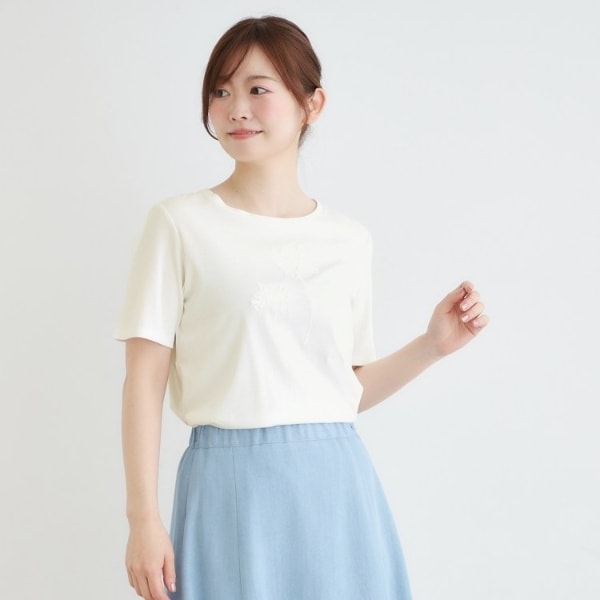 花の部分はリボンテープと刺繍を組み合わせることで立体的な表情を生み出し、シンプルなTシャツに特別感をプラスしています。