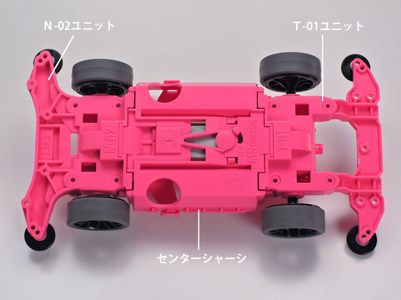 また、ABS樹脂製のMSシャーシ本体とAパーツは鮮やかな蛍光ピンクでコーディネート。クールなボディスタイルとポップなカラーリングのコントラストが魅力たっぷりです。そして、ブラックのYスポークホイールにはグレイのハード小径ローハイトタイヤを装着。ピンクとホワイトのラインやヘッドライト、テールライトはクリヤータイプのステッカーで用意しました。