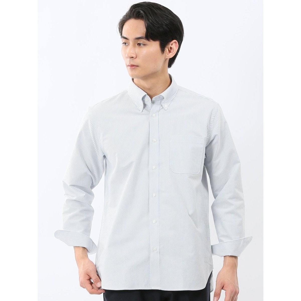 トラッドテイストに仕上げたボタンダウンの長袖シャツです。白・グレーはシンプルな無地、青は爽やかなストライプ柄で清潔感があります。左胸ポケット付きで利便性にも優れています。