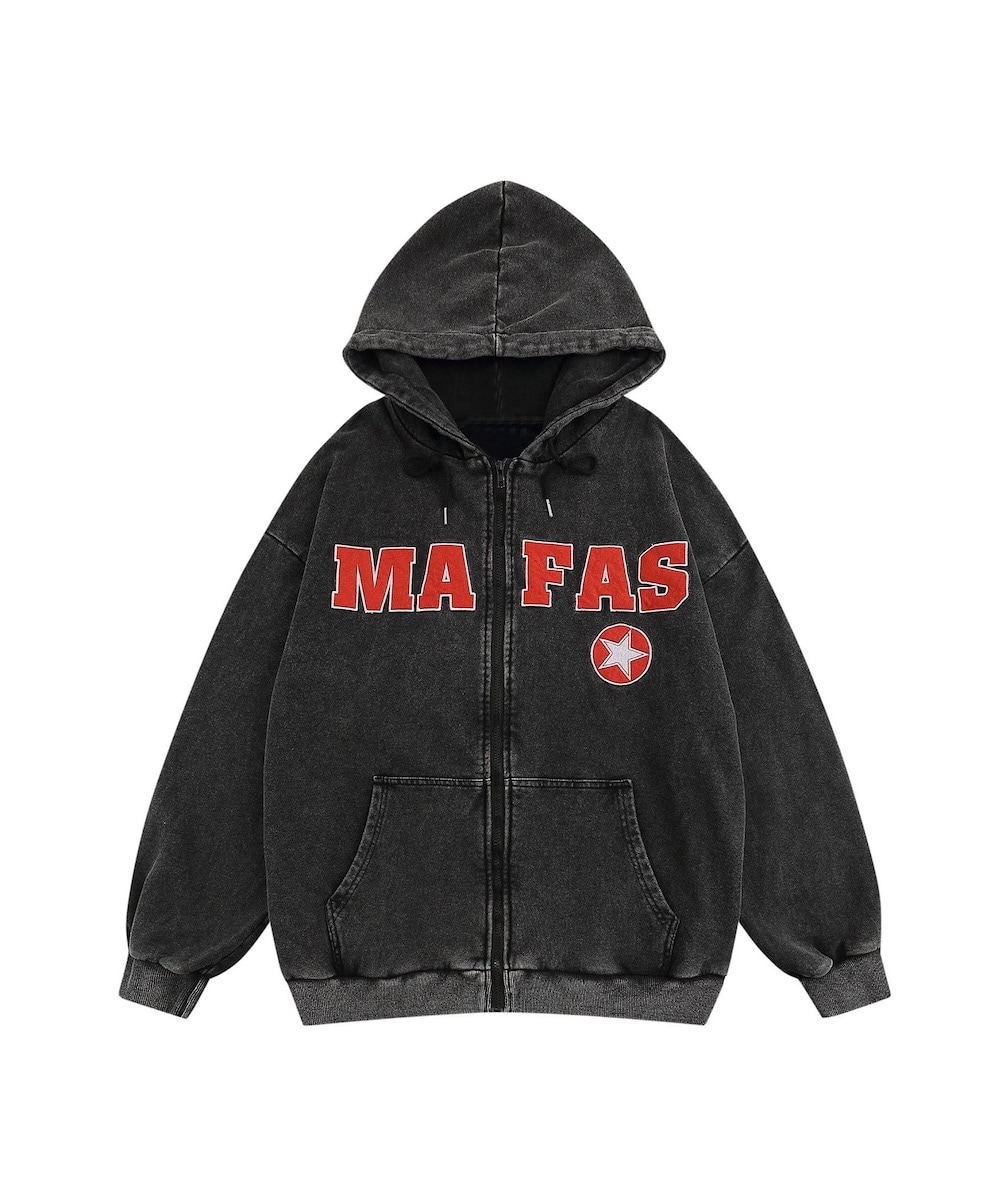 フロントに大きめの英字と星マークがインパクトのあるジップアップパーカー
