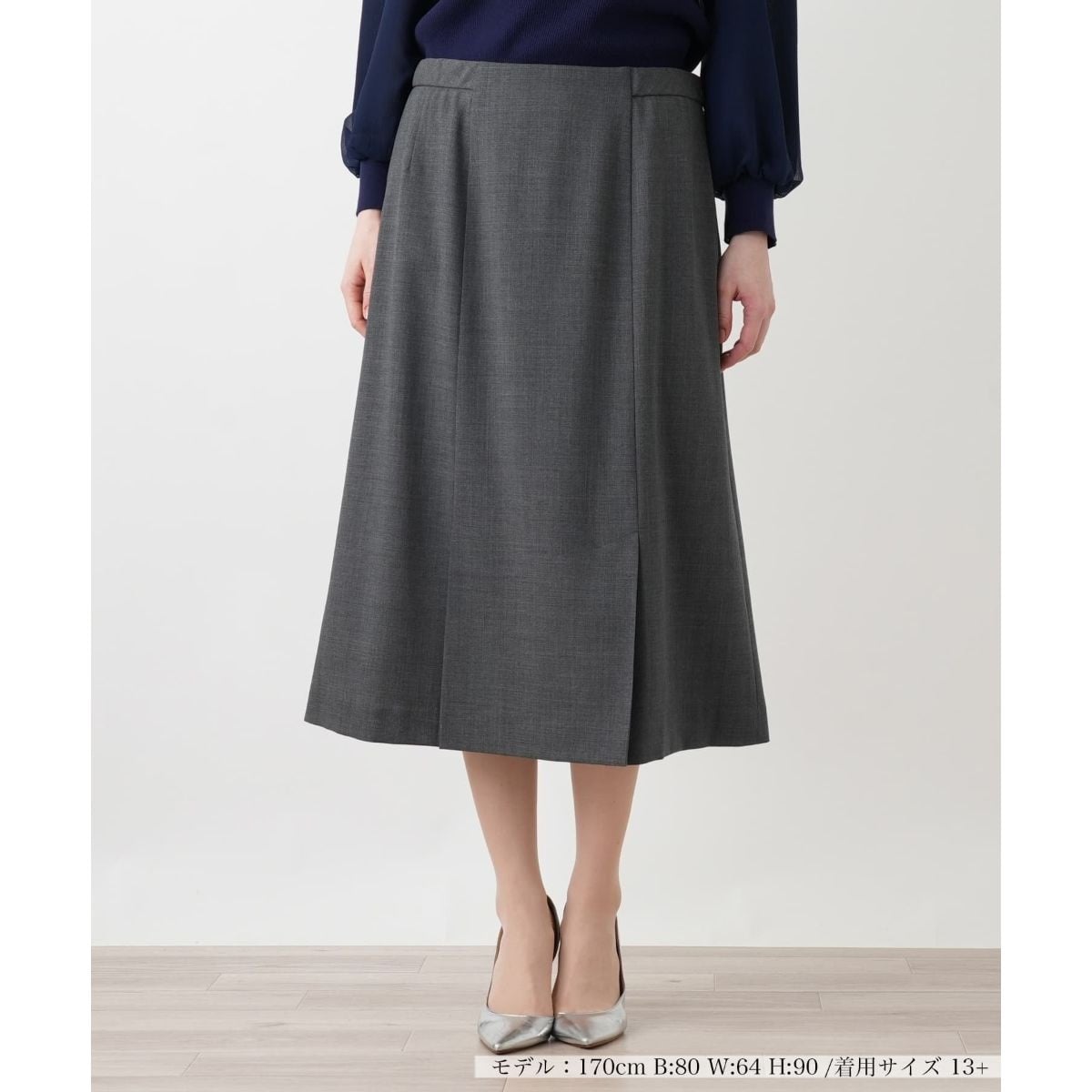 縦のラインを強調するパネル切り替えが、腰まわりをすっきりと見せながら、裾に向かって緩やかに広がる美しいフレアシルエットを描き出します。細やかな織りが感じられる深みのある生地が、落ち着いた知的な雰囲気を演出します。フロントにあしらわれたプリーツが、歩くたびに足元に軽やかな動きを生み出し、立ち姿をよりエレガントに見せるアクセントとなっています。ウエスト周りは装飾を省いたシンプルな仕立てで、全体の洗練された印象を高めます。