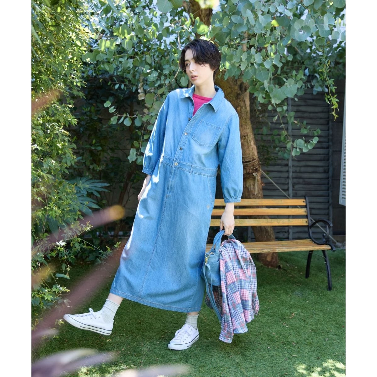 製品洗い加工を施した、軽やかな5オンスデニムのシャツワンピース。やや薄手の爽やかな肌触りで初夏の汗ばむ季節でもさらりと快適に着用いただけます。フロントはハーフプラケット仕様にすることで、胸元にすっきりとした抜け感をプラス。左ウエストポケットにさりげなくあしらわれた刺繍が、シンプルなデザインのアクセントとして上品な個性を引き立てます。ウエスト切り替えが腰位置を高く見せつつ、背面のタックが柔らかな立体感を作り、スタイルアップ効果をもたらします。