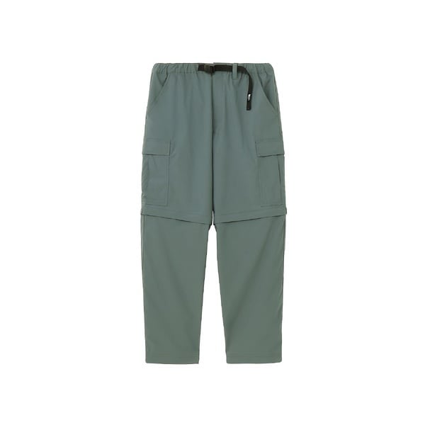 水場のキャンプシーンでも活躍する、コンバーチブルのカーゴパンツ。ポリエステルながら自然な風合いの生地はややストレッチ性があり、脚の動きにスムーズに追従。フッ素化合物を含まないはっ水剤を使用したはっ水加工を施しており、多少の雨にも対応します。ファスナーで着脱ができ、暑い日中やウォーターシーンではショーツ、肌寒い夜はロングパンツとして着用できるほか、ファスナーを途中まで開いてベンチレーションとして使うことも可能です。裾部分を分離しても左右が分かるように、ファスナーの引き手の色を分けています。両サイドに大容量のカーゴポケットを配置し、収納性も高めています。ウエストはウェビングベルト仕様。ややゆったりめのサイズ感で穿きやすく、タウンユースにも快適な1着です。