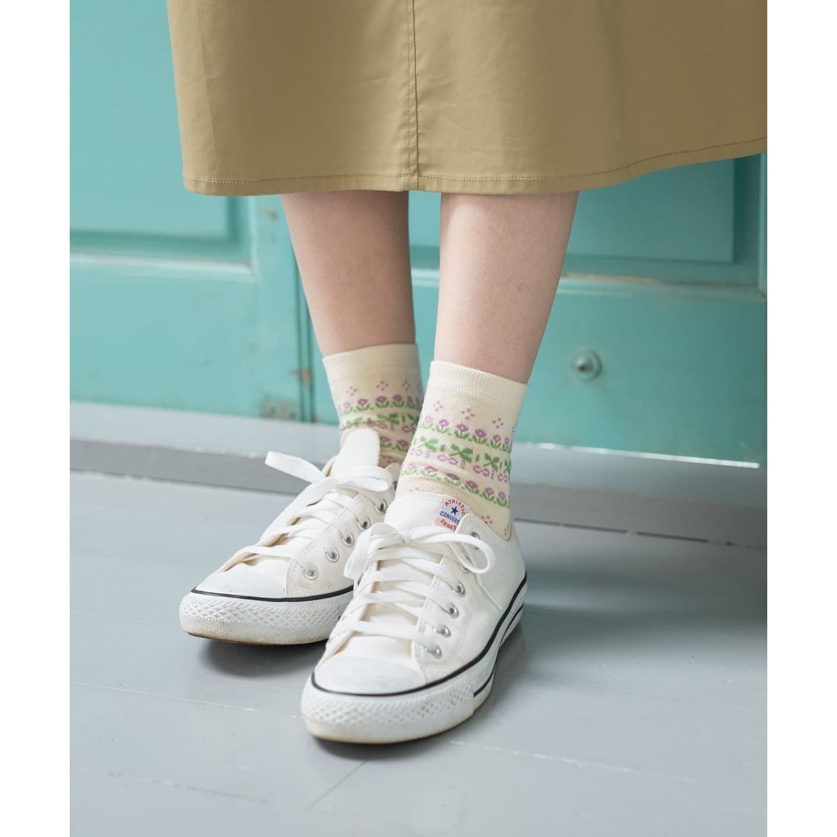 上品な色合いの生地に細やかなボタニカル模様をあしらったショートソックス。履き口部分には可憐な小花とリボンのようなモチーフをボーダー状に配し、足元に程よいアクセントを添えてくれます。全体に散りばめられた小さなドットが、清涼感のあるカラーリングと相まってクリーンな印象。柔らかな素材感で肌当たりが良く、サンダルやローファーと合わせた軽やかな初夏のコーディネートに最適。主張しすぎず、カジュアルからきれいめまで幅広いスタイルに馴染みます。
