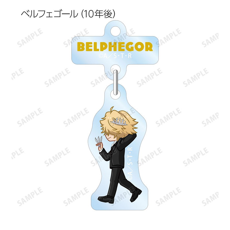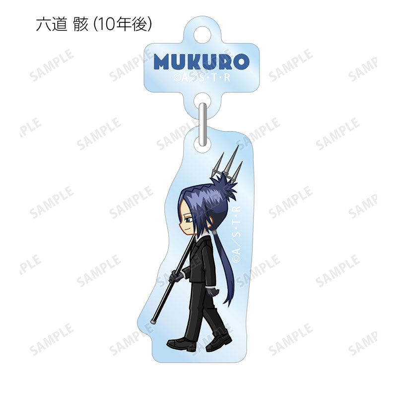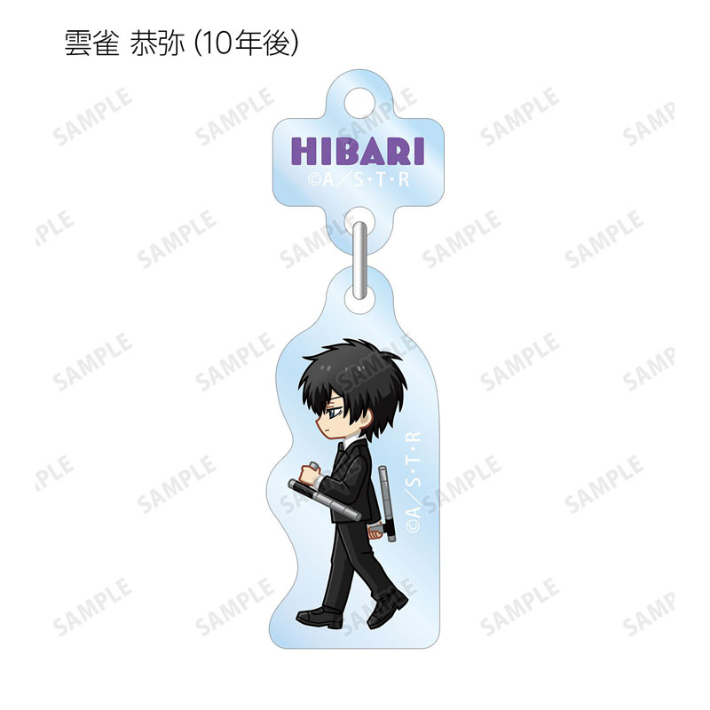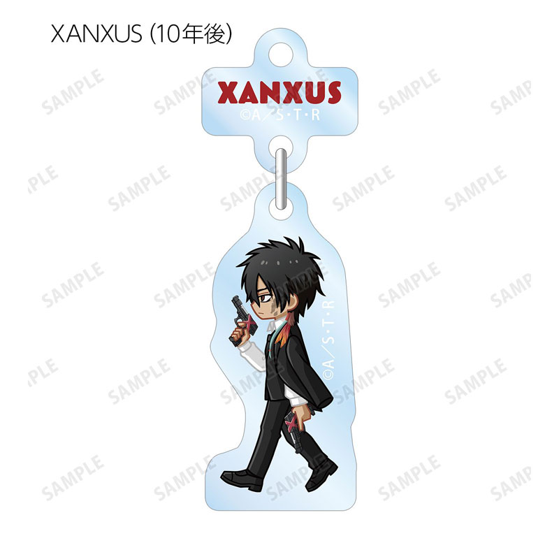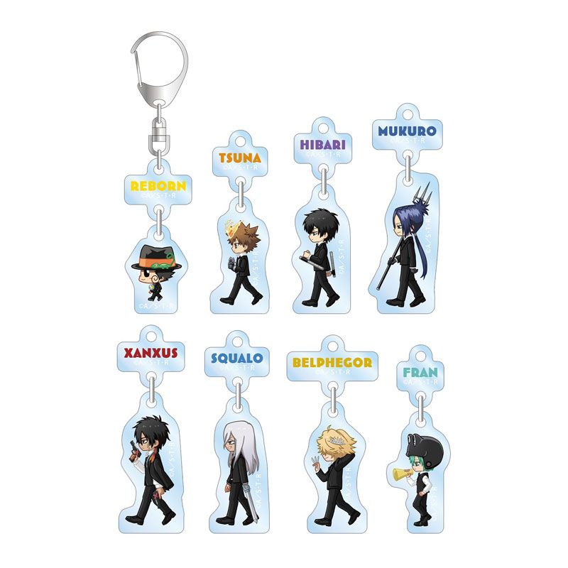 リボーン、沢田綱吉、雲雀恭弥(10年後)、六道骸(10年後)、XANXUS(10年後)、スペルビ・スクアーロ(10年後)、ベルフェゴール(10年後)、フランが歩いているちびキャラを新たに描き起こし、ゆらゆら動くアクリルキーホルダーに仕上げました。