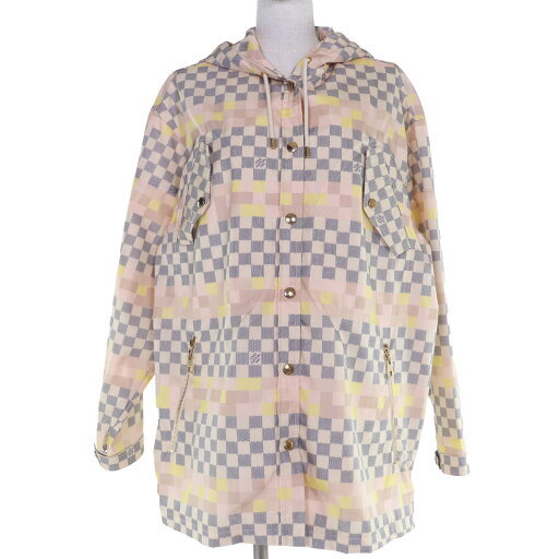 極美品☆LOUIS VUITTON ルイヴィトン レザーパイピング モノグラムフリンジ ノーカラーコート ホワイト インディゴ 34 イタリア製 正規品 レディース【中古】