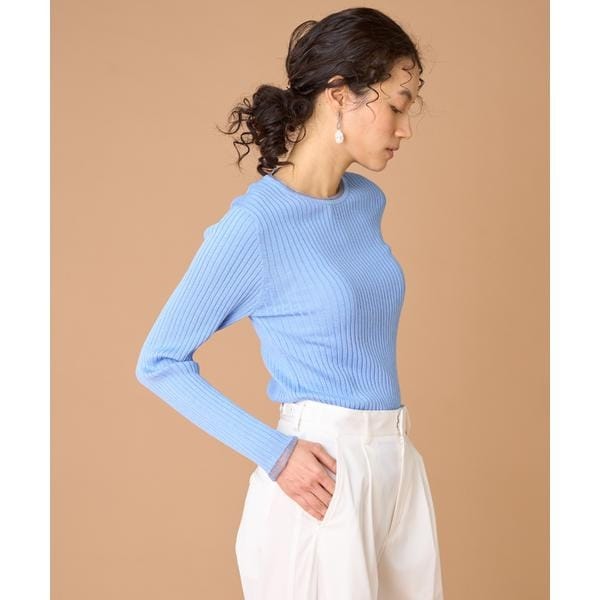■デザインワイドリブで編み立てられているので適度な伸縮性を持ちつつ、体のラインを拾いにくいサイジングにすることでスタイリングに女性らしい表情をプラスしてくれます。衿と袖口にデザインされたシアー糸の部分使いがトレンド感のあるアクセントに。合わせるボトムスを問わず、ジャケットのインナーとしてなど、幅広いシーンで活躍してくれるアイテムです。 ■素材シルクを長年に渡り扱ってきた紡績メーカーにより、上質なシルクだけを厳選して使い紡績されたシルクコットンの素材です。シルクには長繊維特有の上品な光沢があり、滑らかな肌触りとシワになりにくい特性を持ちます。また、タンパク質が主成分の為、とても肌なじみが良く吸質性と放湿性などの機能性にも優れています。上質なシルクと合わせるべく、コットンもまた白度が高く発色性の良い上質な超長綿を使用しています。上質な素材で極細に撚糸された、上品かつ繊細な質感と柔らかい着心地で包み込んでくれる素材です。・水洗い可■サンプル撮影商品画像の商品はサンプルです。実際の商品とはサイズや色味、素材、デザイン等の仕様が若干変更になる場合がございます。■カラーについては、可能な限り実際の商品に近いカラーで撮影をおこなっておりますが、照明の関係により実際の製品とは色味が違って見える場合があります。またパソコン・スマートフォンなどの環境により、若干製品と画像のカラーが異なる場合もございます。現物と画像のカラー差異については返品理由となりませんので、予めご了承ください。■サイズ表記はあくまで目安となります。