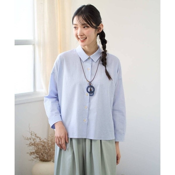 ホワイトストライプ シャーリングシャツ ノーアイロン 胸のギャザーが可愛い