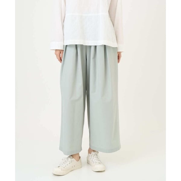 総ゴム仕様で、着脱がラクにできるワイドストレートパンツです。ハリ・コシのある生地を活かし、前ウエストには左右にボックスタックのアクセントを施しています。ボリュームを抑えつつ、自然ですっきりとしたシルエットに仕上げています。ウエストはリラックス感のある履き心地ながら、きれいめのラインをキープできるため、カジュアルからオフィスまで幅広く活躍し、快適さと上品さを両立した一枚になっています。
