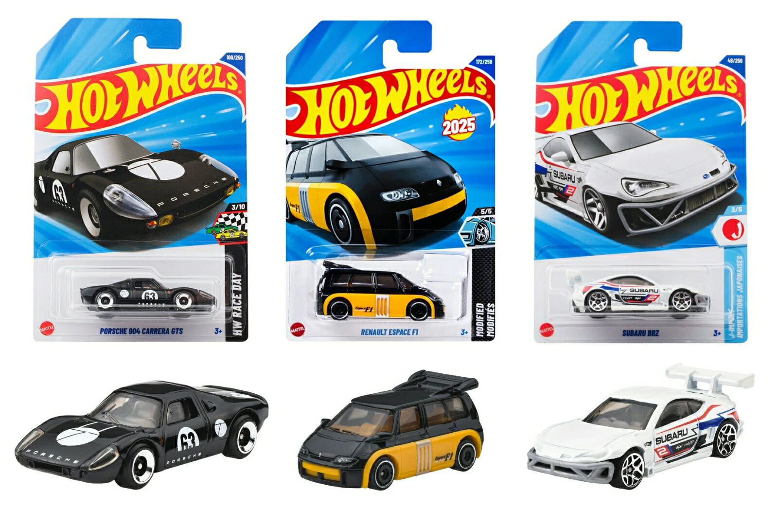 <セット内容>ホットウィール(Hot Wheels) ベーシックカー ポルシェ 904 カレラ GTS 乗り物おもちゃ ミニカー 3歳から ブラック JFN75ホットウィール(Hot Wheels) ベーシックカー ルノー エスパス F1 乗り物おもちゃ ミニカー 3歳から ブラック JFN82ホットウィール(Hot Wheels) ベーシックカー スバル BRZ 乗り物おもちゃ ミニカー 3歳から ホワイト JFN55ーーーーーーーーーーーーーーーーーーーーーーー◆◇ホットウィール(Hot Wheels) ベーシックカー ポルシェ 904 カレラ GTS 乗り物おもちゃ ミニカー 3歳から ブラック JFN75◇◆【内容】1964年にレースデビューしたポルシェ 904 カレラGTSは、抜群のハンドリングと高い耐久性で知られ、同年のル・マン24時間でクラス優勝を含めて、数多くの勝利を収めた。ホットウィールは全高の低い独特なフォルムを忠実に再現し、ポルシェファン向けメディア『タイプ7』のロゴもあしらっている。【注意】ブリスターカードの裏面は日本語パッケージとなります。【原産国】マレーシア【対象年齢】3歳〜◆◇ホットウィール(Hot Wheels) ベーシックカー ルノー エスパス F1 乗り物おもちゃ ミニカー 3歳から ブラック JFN82◇◆【内容】欧州ミニバンの元祖とされる、1984年発売のルノーのエスパス。ホットウィールがモチーフに選んだのは、1991年に登場した2代目エスパスをベースにルノーがF1マシンのエンジン、足回りを搭載して作ったエスパス F1である。実車とは外観の黄色と黒の配色が逆になっている。 【注意】ブリスターカードの裏面は日本語パッケージとなります。【原産国】マレーシア【対象年齢】3歳〜◆◇ホットウィール(Hot Wheels) ベーシックカー スバル BRZ 乗り物おもちゃ ミニカー 3歳から ホワイト JFN55◇◆【内容】トヨタとスバルが共同開発したFRスポーツに、T.R.A.京都の「パンデム」仕様を再現。ビス留めオーバーフェンダーに、バッシュバー&インタークーラーを装着した、ドリ車スタイルの仕上がり。水平対向エンジン由来の低重心と軽快な走りもしっかり表現されている。 【注意】ブリスターカードの裏面は日本語パッケージとなります。【原産国】マレーシア【対象年齢】3歳〜ーーーーーーーーーーーーーーーーーーーーーーー【Brandについて】カリフォルニア生まれ 1秒間に16台売れているミニカー。【ホットウィール】Hot Wheels=「かっこいい車!」独特な南カルフォルニア風の外観、高速に動くホイール、(当時の最新技術!)そして 赤いラインの入ったタイヤ。現在、世界で一番売れているミニカーです*。*Circana/Retail Tracking Service/G12/JAN-DEC 2023/Total Toys/Projected Units【プレゼントに最適】お誕生日、クリスマスプレゼント、入園・入学祝いなど記念日でのプレゼントにぴったりです。