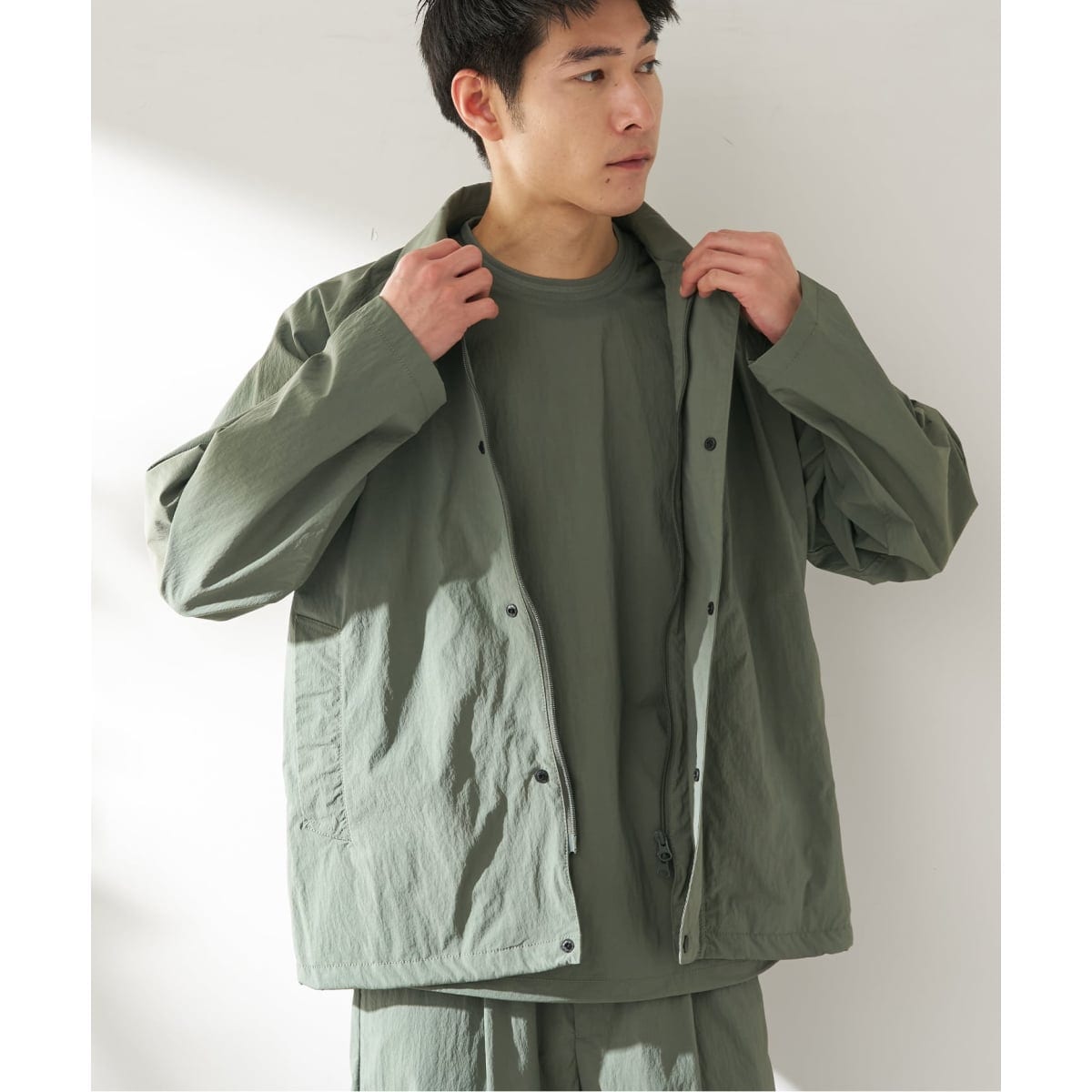 軽量でサラッとした質感が特徴のナイロン素材をベースにしており、羽織った瞬間に軽さを感じられる快適な着心地。