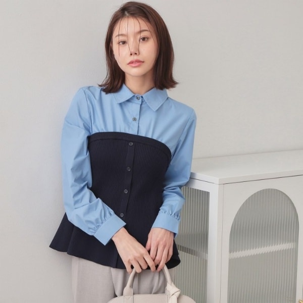 ・抜け感のあるシャツとニットのドッキングスタイルで、カジュアルさとエレガンスを両立させたユニークなデザイン。