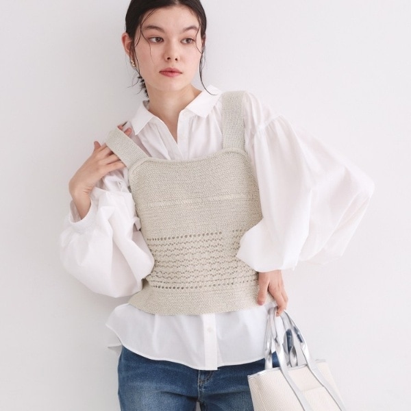 ・透かし編みなど様々な編地で表情を持たせたテープヤーンのビスチェニット。