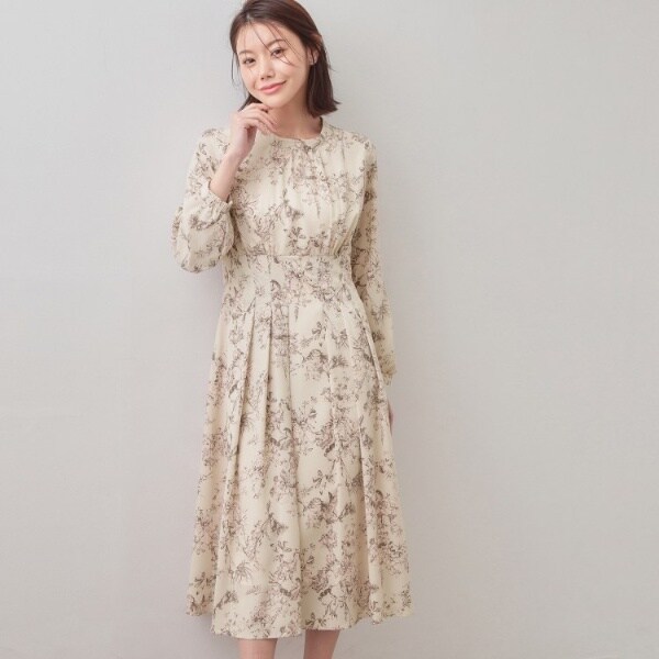 繊細なフラワープリントが印象的なハイネックタックワンピース