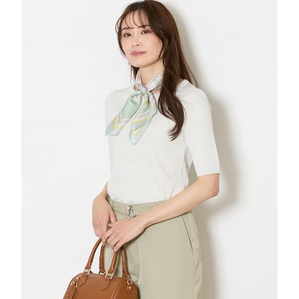 リブをアレンジした編地がすっきりとした印象をつくり、纏うだけで装いを整えます。ジャケットとの衿バランスが良い、ほど良い空きのクルーネックもポイント。また、二の腕を自然にカバーできる5分袖を採用しました。