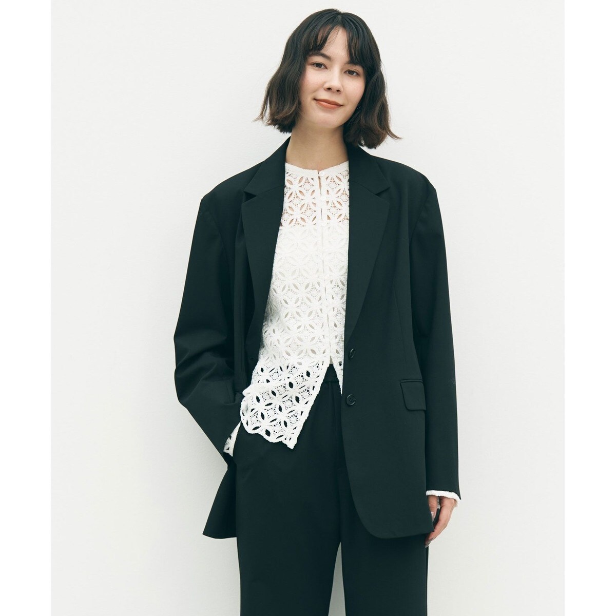 ■デザインマニッシュな印象のシングルオーバージャケット。ミニマルで無駄のないシルエットと、程よいオーバーシルエットで、サラッと羽織るだけでサマになる一枚です。肩が大きく見えないよう肩パットなしで仕立て、軽やかで抜け感のあるバランスに仕上げています。シーズンレスな素材感で、季節に関係なく長く楽しんでいただけます。同素材のボトムとのセットアップでの着こなしはもちろん、デニムを合わせてカジュアルダウンしたスタイルや、レースアイテムを合わせた女性らしいMIXスタイルもおすすめです。