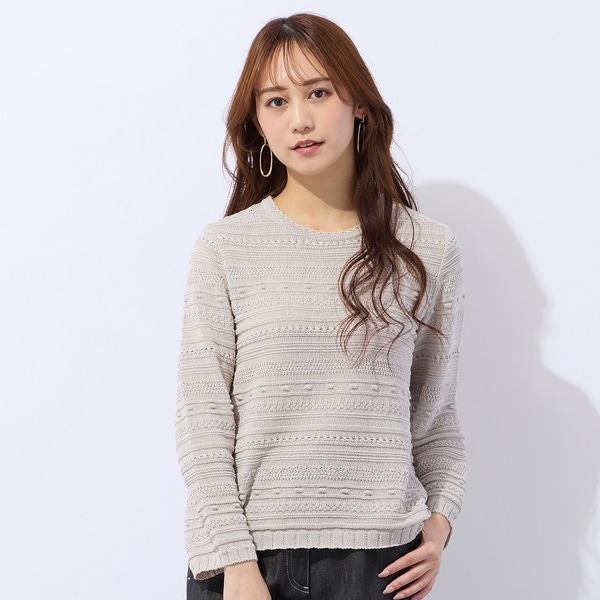 ドライタッチな綿混糸を使用し、編地変化でボーダーを表現したデザインニット。シンプルな中にさりげなく手の込んだ編地と程よい透け感がさわやかな雰囲気。
