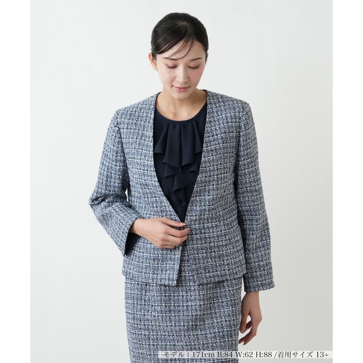 表情豊かなミックスツイードで仕立てた、Vネックのノーカラージャケット。凹凸感を抑え、軽やかに仕上げた生地が、春先の羽織りものにぴったりです。シャープなVネックラインが顔周りをすっきりと見せ、インナー次第で様々な表情を楽しめます。カジュアルな装いからセレモニーまで、幅広いシーンに対応できる着回し力の高い一着です。