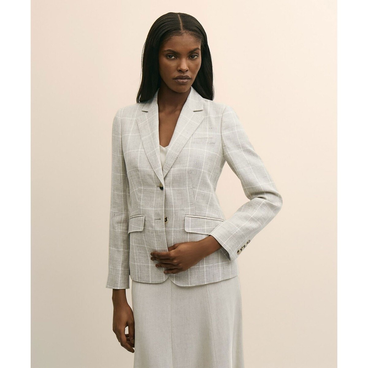 春から夏にかけての装いに最適な、軽く涼しげな素材感のジャケット。淡いベージュにホワイトのウィンドウペイン柄を配したテキスタイルが、控えめながら知的でモダンな印象を与えます。大切な会食やビジネスシーンなど、自信を持って臨みたい日にも相応しい一着です。