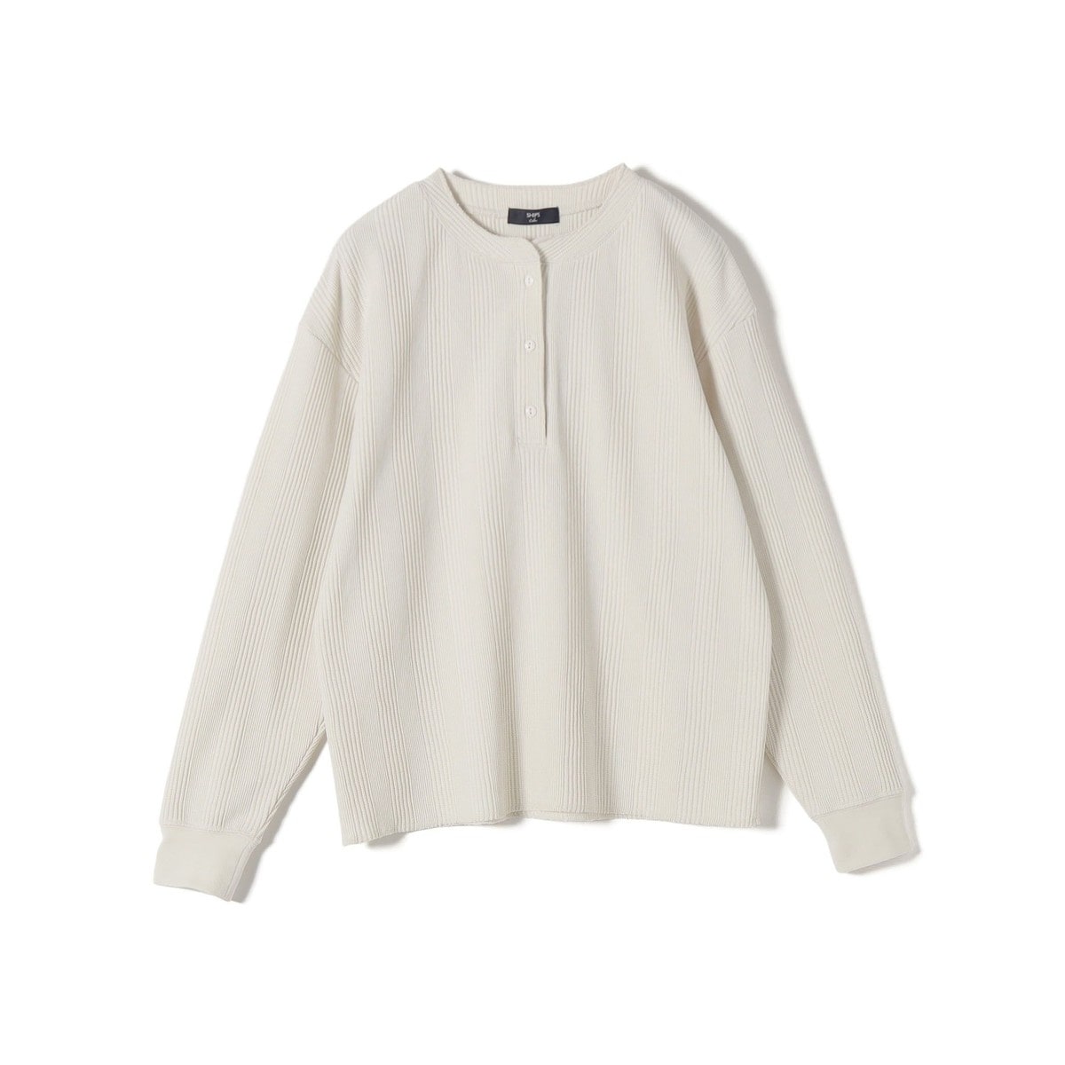 変形ワッフル素材を使用した、ヘンリーネックトップス。