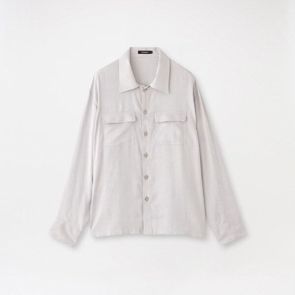 ナノレベルでの技術を駆使して紡績された糸を使用した割繊ポリエステルサテン素材なので、ピーチタッチなエアリーな質感やドレープ性、独特なフィブリル感が特徴です。