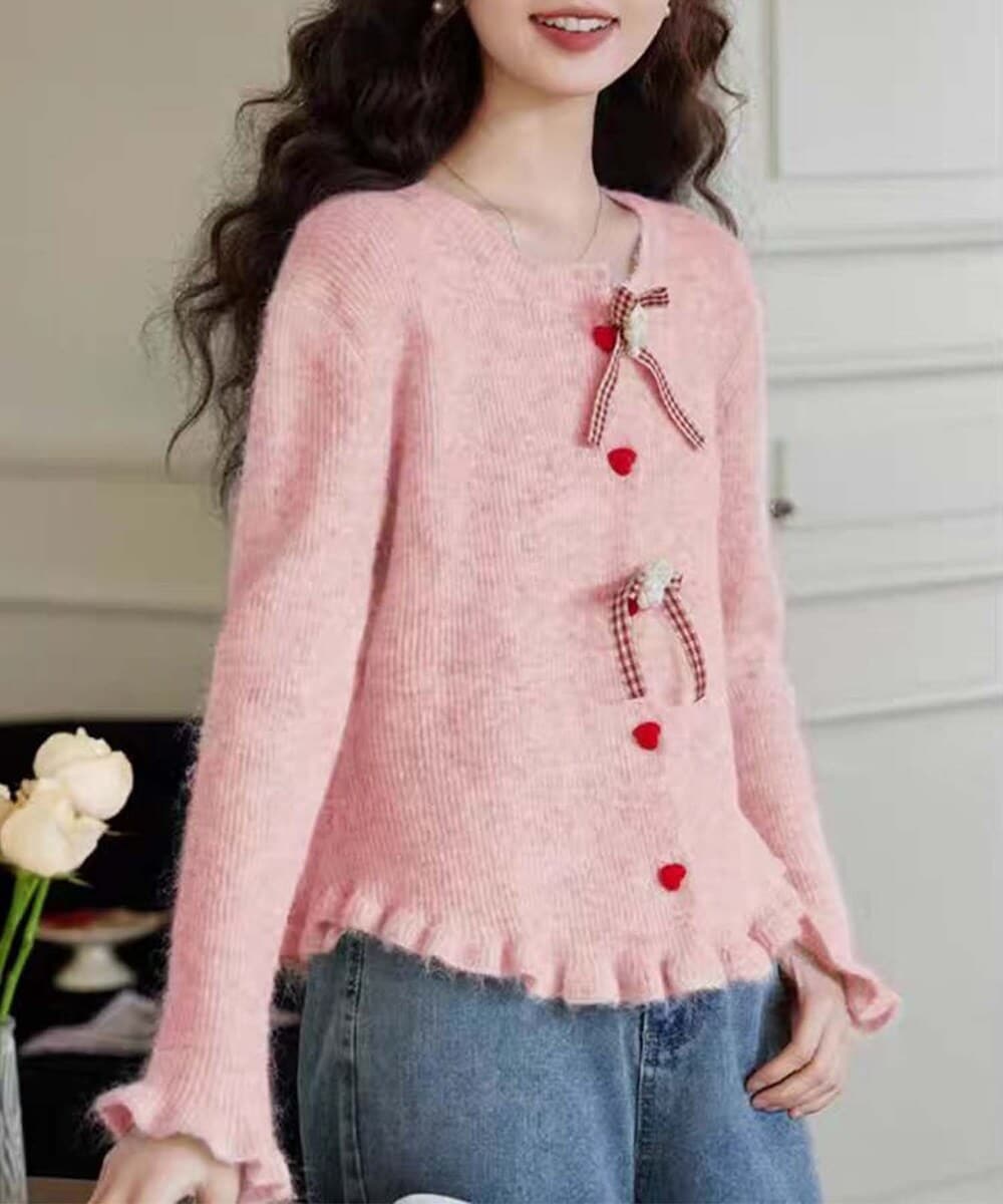 可愛らしいリボンとフリルディテールが魅力のガーリーニットカーディガン。フロントには赤いハートボタンとギンガムチェックのリボンがアクセントとなり、フェミニンで可愛らしいデザインに仕上がっています。袖口や裾に施されたフリルが、より一層エレガントでロマンチックな雰囲気を演出。やわらかく暖かい素材で、肌寒い季節にもぴったりのアイテムです。デートやお出かけなど特別なシーンでも大活躍する、ガーリーコーデの必須アイテムです。