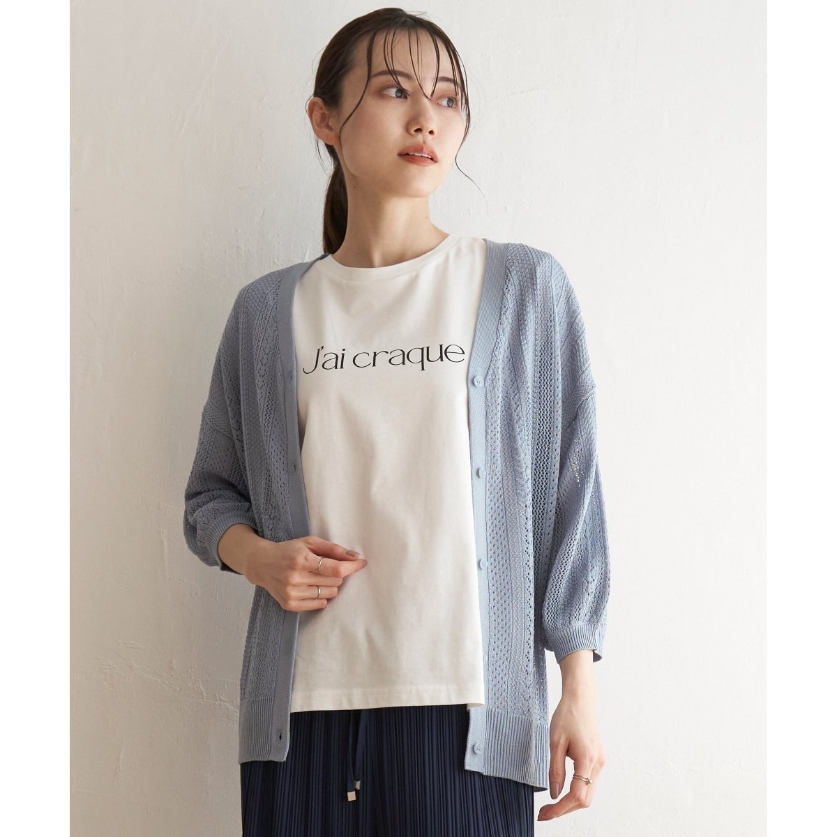 涼しげな透かし編みのニットカーディガン。