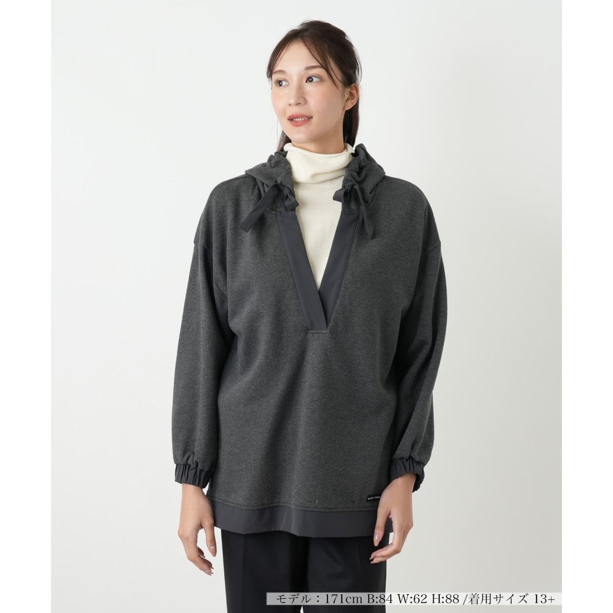 カジュアルなスウェット素材をベースに、異素材使いで遊び心を加えたプルオーバーパーカーです。深めのVネック部分は、異素材の切り替えでシャープな印象をプラス。フード部分にはリボンが通されており、絞ることでギャザーが寄り、女性らしいディテールを演出します。袖口と裾にも異素材を組み合わせたデザインで、シンプルながらも個性的な一枚に仕上げています。ゆったりとしたオーバーサイズシルエットで、体型カバー効果も期待できます。デイリーユースにぴったりの、リラックス感とデザイン性を両立させたアイテムです。