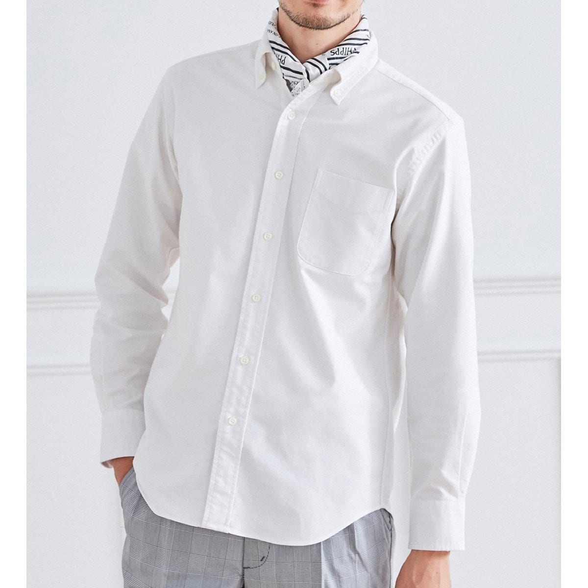 トレンドに左右されることなく使えるきれいめカジュアルコーディネートの定番、長袖ボタンダウンシャツです。