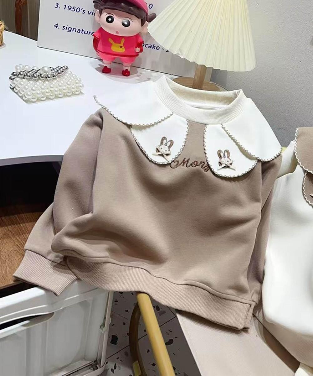 ピンク、オフホワイト、モカの3色展開で、襟元にうさぎの刺繍とパイピングが施されたキッズ用スウェットです。襟付きのデザインが大人っぽく、ガーリーな可愛らしさを引き立てます。肌触りが良く、柔らかさと保温性を兼ね備えているため、寒い季節に最適です。ゆったりとしたシルエットで動きやすく、デイリーからお出かけまで幅広いシーンで活躍するアイテムです。