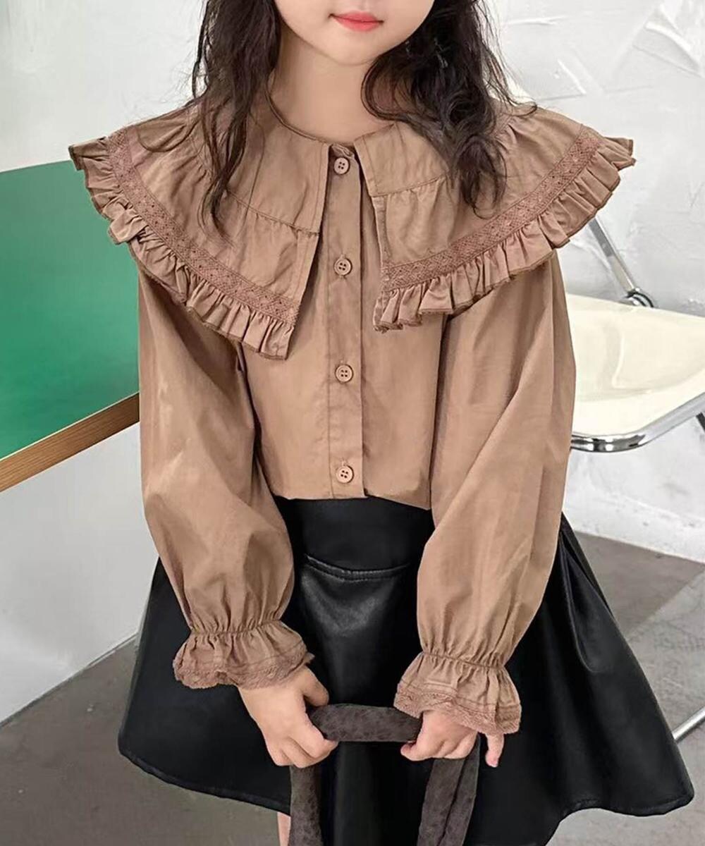 フリルの大きな襟デザインが特徴のキッズシャツ。シンプルなデザインに華やかさが加わり、可愛らしさが引き立ちます。ゆったりとしたシルエットで、動きやすく、着心地もいい。柔らかく、肌触りが良く、通気性にも優れているので、春から秋にかけて活躍します。