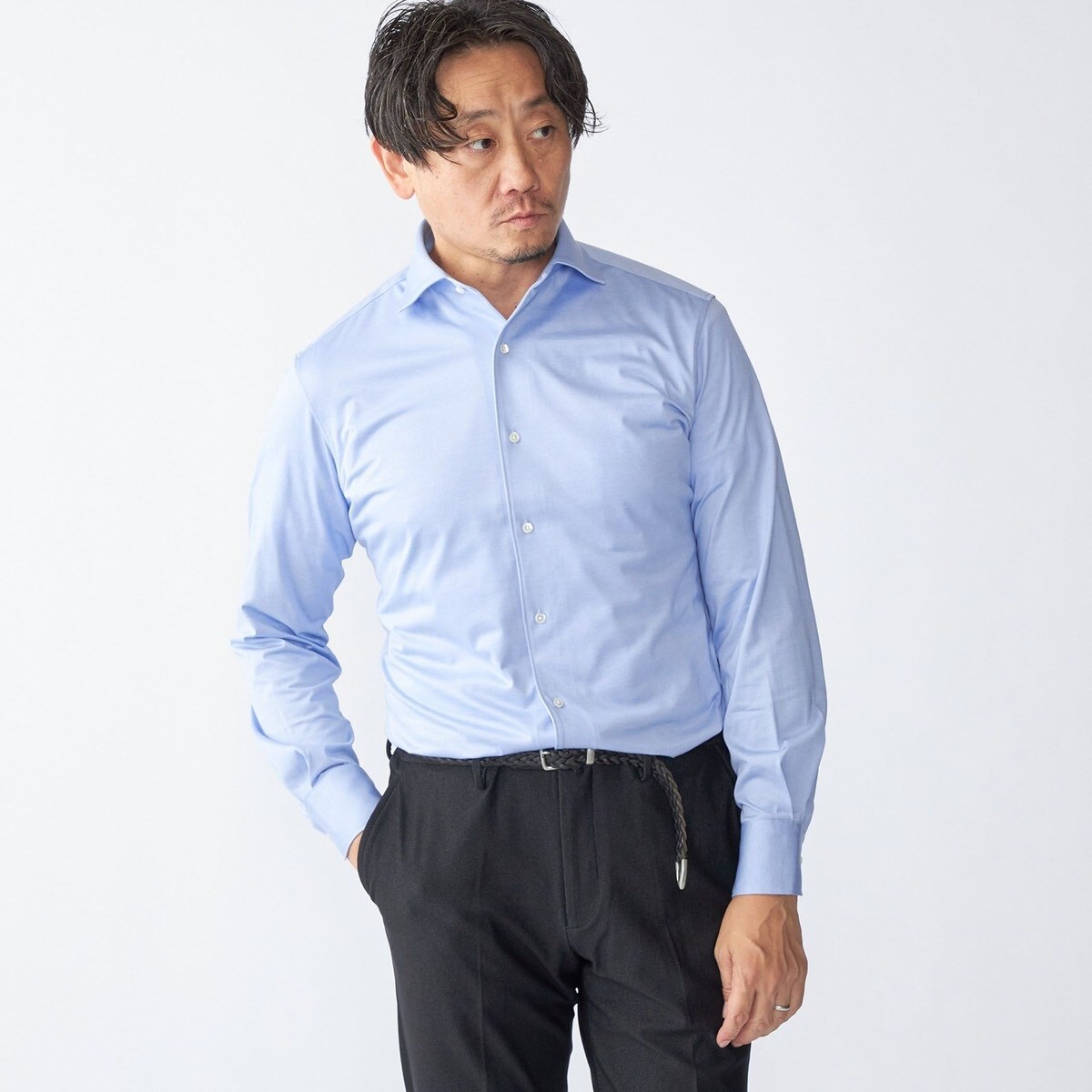 ジャージー素材でありながら、ドレスシャツのようなハリコシと滑らかさ、上品な光沢感を持ち合わせたストレスを感じないシャツに仕上がっております。