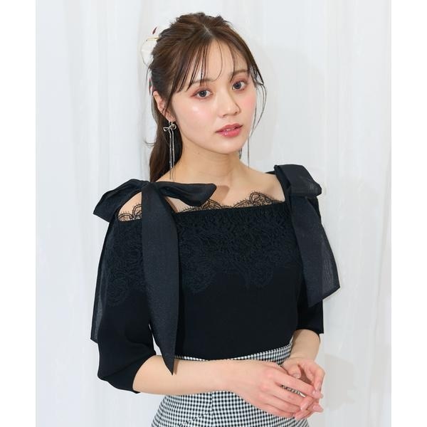 シアーなショルダーリボンと胸元のレースが軽やかさを演出するオフショル風トップス【Design】・オフショル風のデザインがヘルシーな肌見せを叶えるニットプルオーバー。・襟元を彩るレースが上品な雰囲気をプラスしてくれます。・肩のリボンはお好みの長さに調整が可能◎・袖口はリブ仕立てになっており、きゅっと体にフィットするので、ふんわりとまるいシルエットを演出してくれます!・コンパクトな着丈感なので、ハイウエストなスカートなどとコーディネートするフェミニンスタイルがおすすめ♪・エネルギッシュなオレンジ、マリンテイストなボーダー柄もご用意いたしました。・肩のリボンの根本はボタン留め仕様なので、取り外しが可能。【Fabic】・伸縮性のあるニット地を使用。・肩リボンはほんのりと透け感のある柔らかな生地を使用。・ご自宅でお手入れが出来るのも嬉しいポイント♪・ホワイト、オレンジ、ホワイト×ネイビー、ブラックの4色展開となります。【Care】手洗い可能