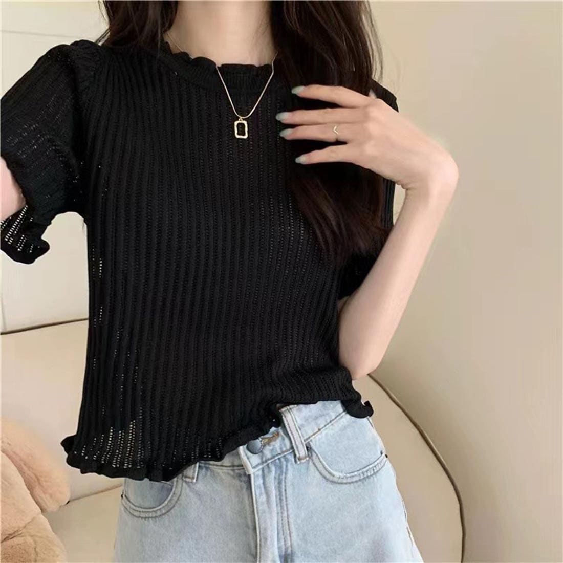 大人かわいい透かし編み半袖フリルニットが登場♪<br>