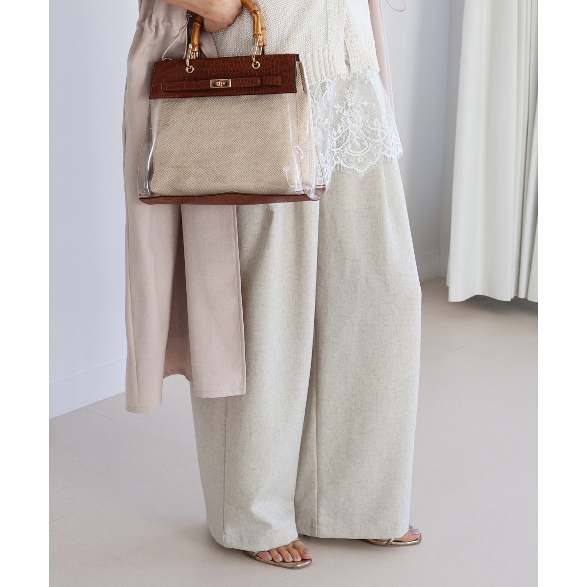 麻混素材ならではの清涼感とトレンド感のあるメランジ調の表面が大人っぽいニュアンスを演出するタックパンツ。