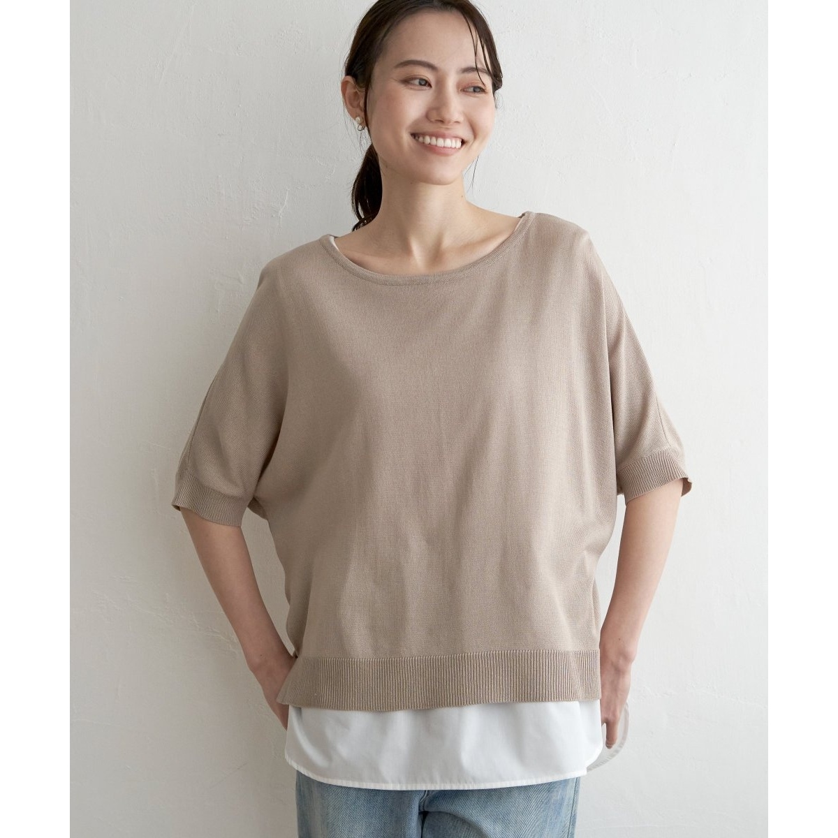 シンプルなドルマンニットのゆったりシルエットの中に、タンクトップ型インナーを合わせたアンサンブル。