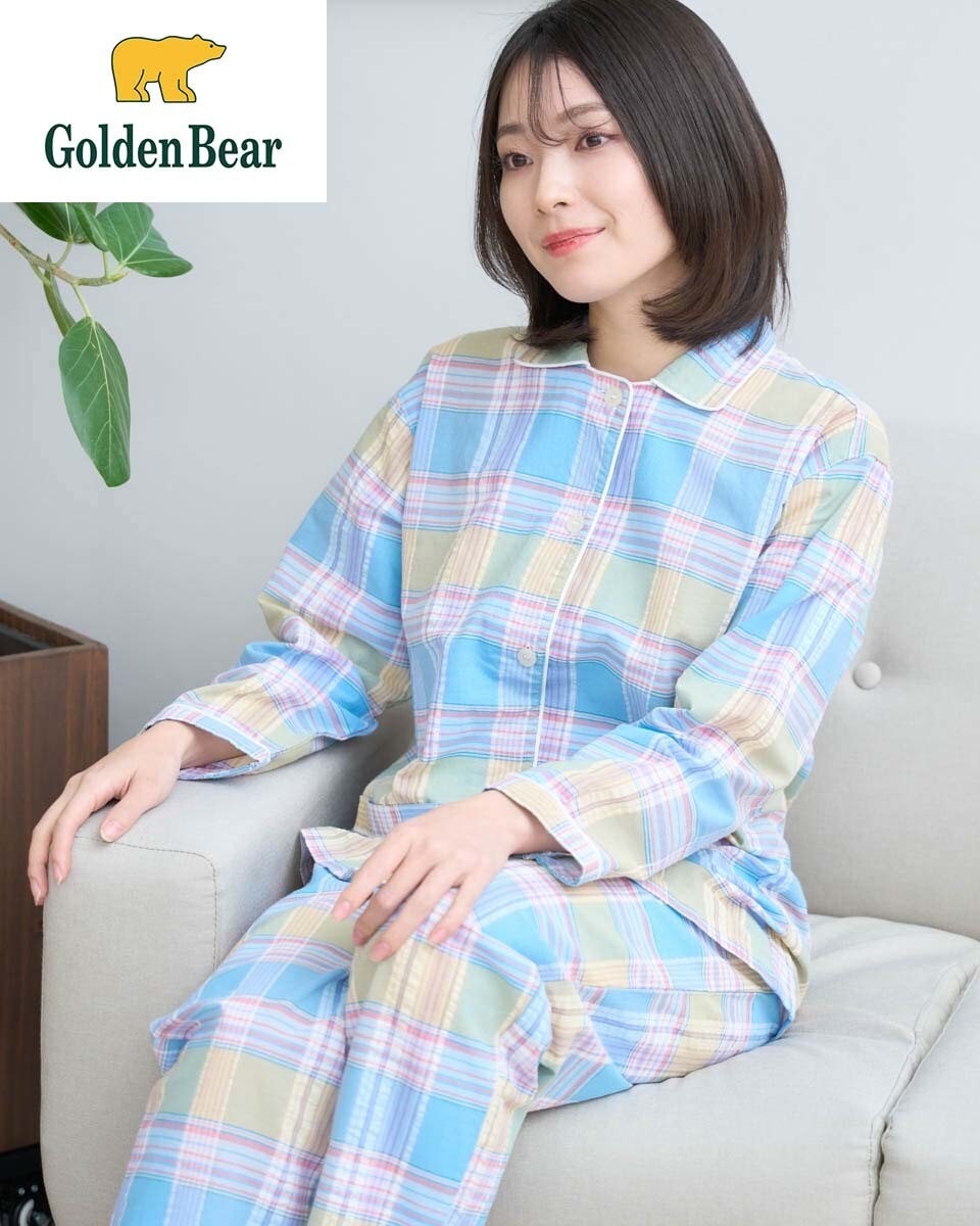 送料無料!サッカー生地のサラリとした肌触り&清涼感!格子柄 長袖 綿混レディースパジャマ1組